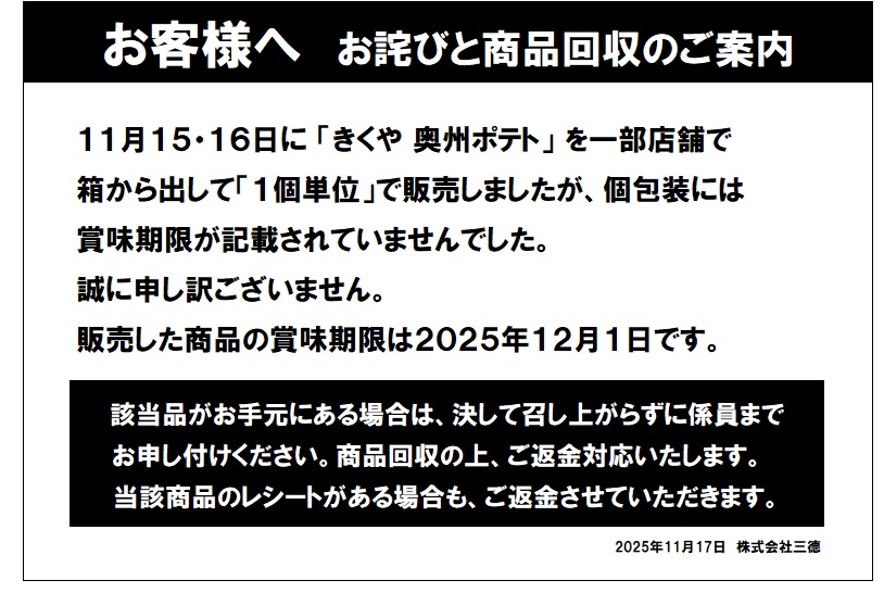 お詫びと商品回収(町田山崎店・早稲田店・茗荷谷店・南大沢店・四街道店)