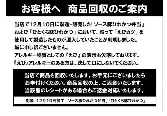 貝取店 商品回収のお知らせ