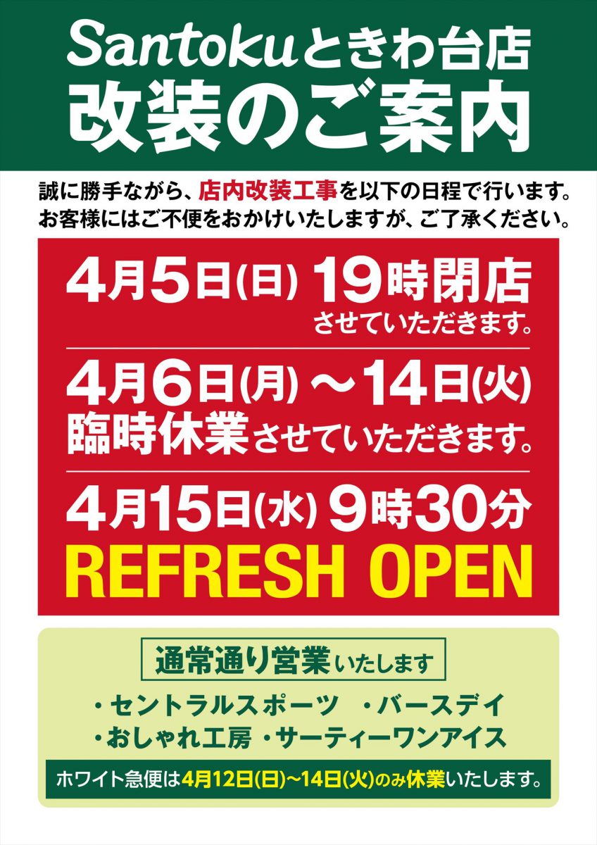 ときわ台店 改装休業のお知らせ